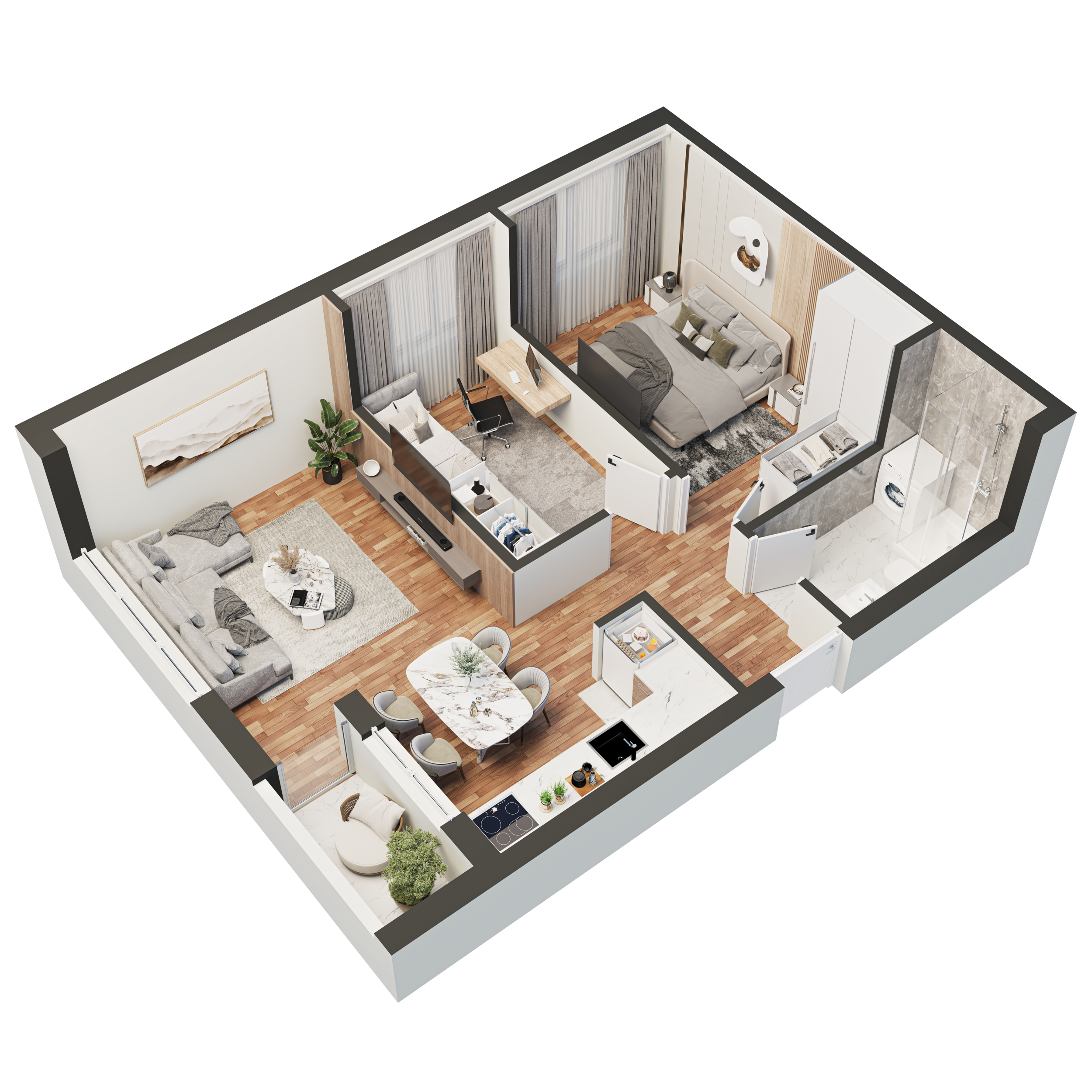 Sastoji se od dnevnog boravka, trpezarije, kuhinje, kupatila, dve sobe i terase.